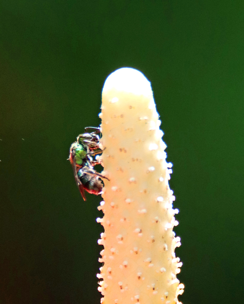 Augochlorine Sweat Bees, Tribe Augochlorini - This tiny little bee on the Spadix of an Anthurium (not a large pistil) was, I first thought, a Green Orchid Bee, but the AI of iNaturalist says no, it is one of many different species of sweat bees and once I post it on iNaturalist, it may or may not be given a species … Continue reading "Augochlorine Sweat Bees, Tribe Augochlorini"