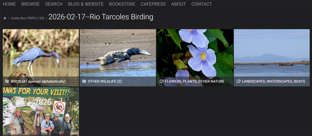Rio Tarcoles ’26 Gallery Ready - Simply click on the gallery image below to go there or you can go to this address: https://charliedoggett.smugmug.com/TRIPS/Rio-Tarcoles-Birding-Boat-Tour And if you don’t go to the gallery, here’s one of the pix of our little birding group from Canada & me. 🙂 ¡Pura Vida! And I never said earlier, but we shared our boat with a …