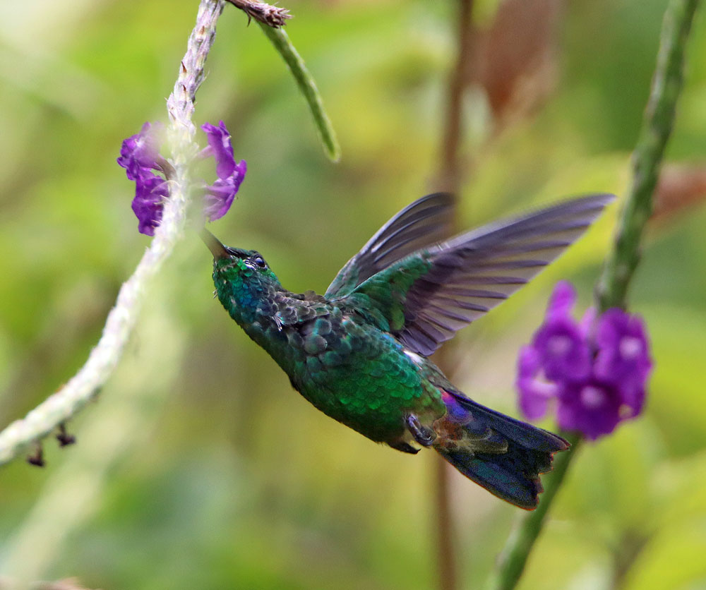 Blue-vented Hummingbird - This is one of the few hummingbirds not totally chased off by the Rufous-tailed Hummingbird, though he is only an occasional visitor to my Porterweed Flowers. See more of this species in my gallery: Blue-vented Hummingbird. And two more totally different shots . . .