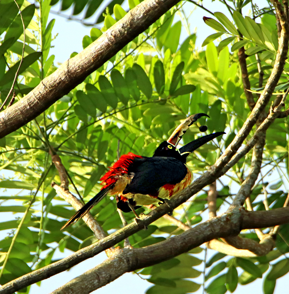 Smaller than either of the above two, this one is the same size as his cousin on the Pacific Slope, the Fiery-billed Aracari, but colored differently, especially the beaks. Below I will link to both Aracari galleries so you can compare . . . 🙂