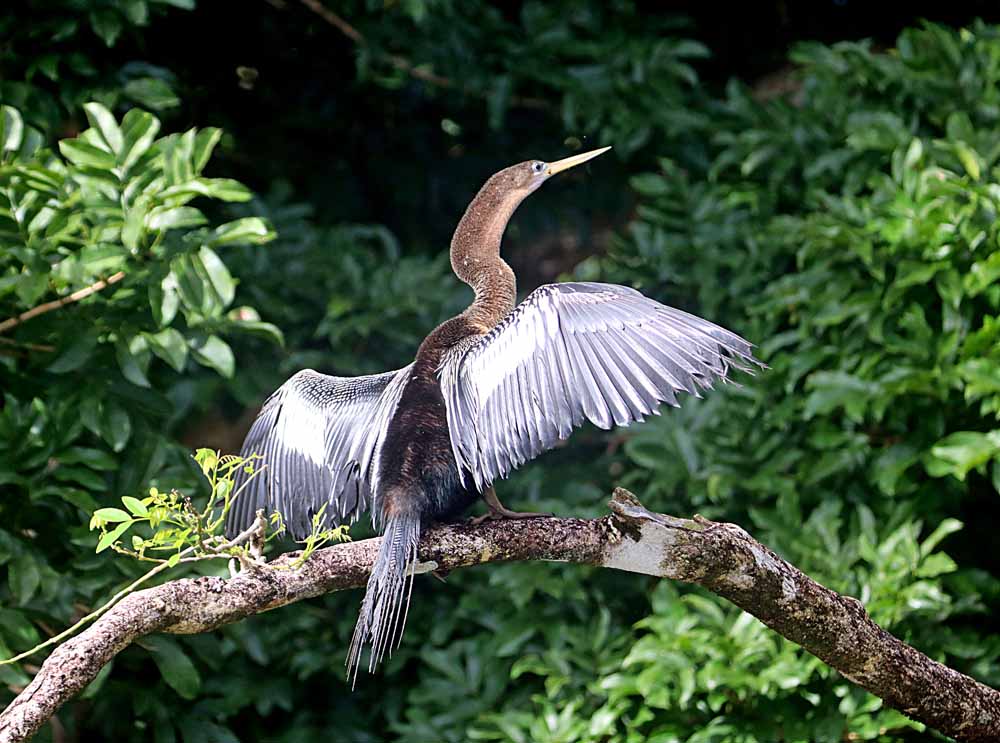 The Anhinga, sometimes called “Snake Bird” because when swimming with his long neck out of the water he/she looks like a snake swimming. This bird is found in all of the tropical Americas on the water where it dives into the water to catch a fish and then afterwards sun-dries itself on a tree as in these two photos, one a male (all black) and one a female (with brown neck). See more of my photos from Costa Rica in the Anhinga Gallery (linked) with most seen on rivers, though also on lakes.