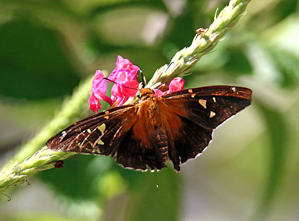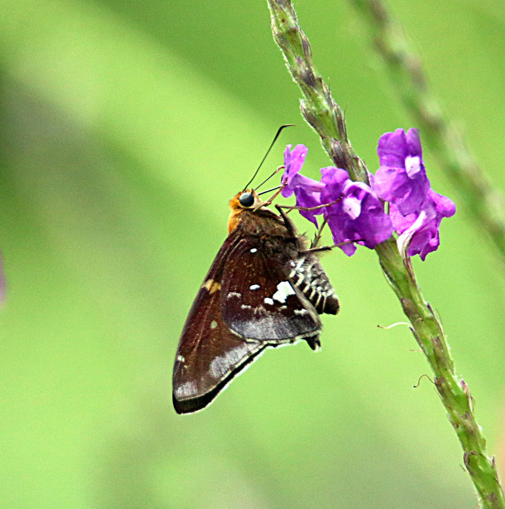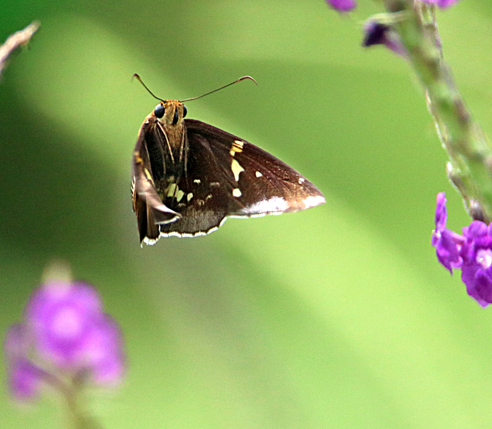 Most of my photos of this species and most in online systems show side views of the Broken Silverdrop, Epargyreus exadeus cruza (my gallery link) with this top view being the second top view on both iNaturalist & BAMONA, so a unique photo! And I have 2 top views in my gallery! 🙂 The feature and two other photos here . . .