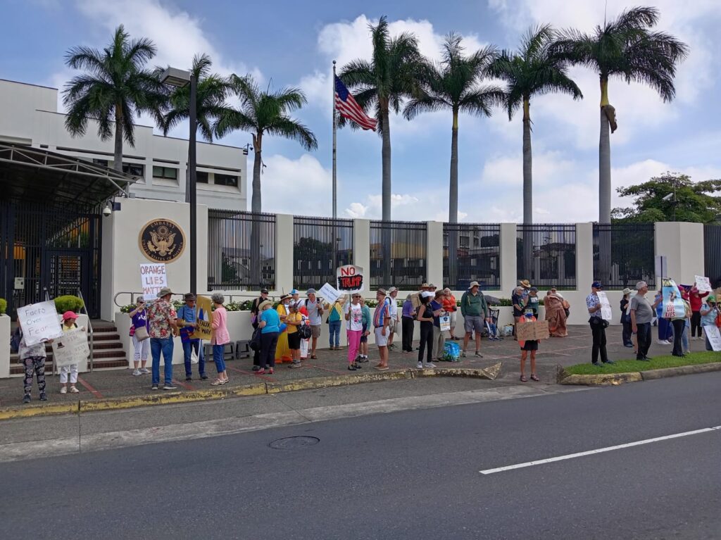 About 100 Americans showed up for the demonstration out of the approximately 120,000 American citizens living in Costa Rica. 🙂 And if wondering about Atenas, we had a bus load of 48 there from the approximately 3,000 Americans living in Atenas Canton (county). That 3,000 figure is from the Municipality of Atenas and is approximate. FYI, the U.S. Department of State says that approximately 9 million U.S. Citizens live in other countries around the world, so we are just a fraction of that in Costa Rica or Atenas. 🙂