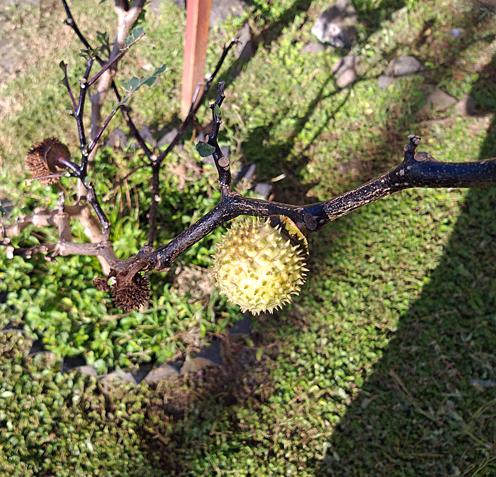 This fruit or “seed capsule” is described on Wikipedia: “At maturity, it splits into four chambers, each with dozens of small, black seeds.” This Wikipedia article also says that “The flowers open at night, emitting a pleasant fragrance, and are fed upon by nocturnal moths.” Other common name besides Devil’s Trumpet are Angel’s Trumpet, Thorny Apple, Jimson Weed and in Costa Rica Spanish “Manto de Cristo.” Like most plant common names, it depends on the locale or country. 🙂 The scientific name is Datura metel and another almost identical one is Datura stramonium. Both are originally from Asia, though I think only Datura metel is found in Latin America. The iNaturalist article shares more information in conjunction with Wikipedia. Plus an article on the similar species in Wikipedia: Datura stramonium.