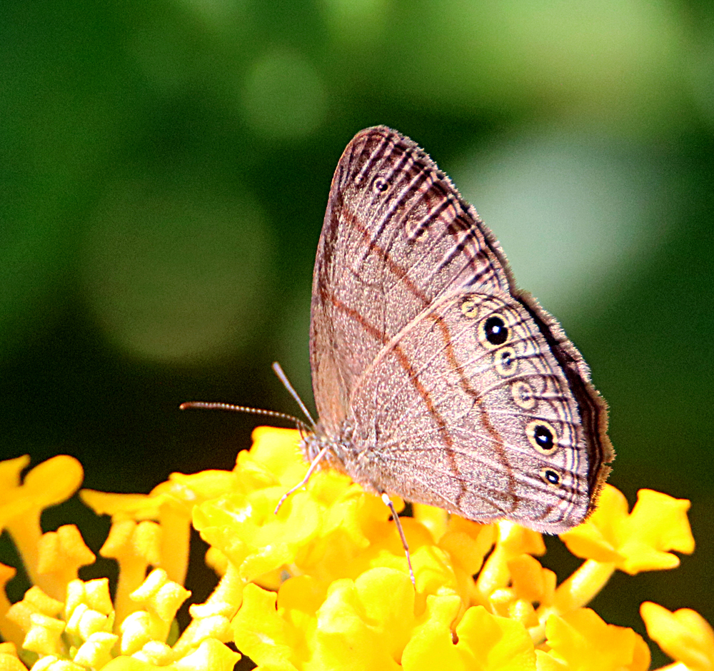 In the past two years this was seen more often than this year for some reason. It was frequently near the ground or on grasses and ground-cover, but this time in October mostly on my Lantana flowers. It is very small, about the size of my thumbnail when his wings are folded. See more of my photos in the GALLERY: Hermes Satyr. This species is almost identical to another one found in the U.S. called Carolina Satyr, which is what I first labeled these guys here, but all indications are that here in Central America they are called Hermes and considered a different species. Here’s two shots from my garden . . .