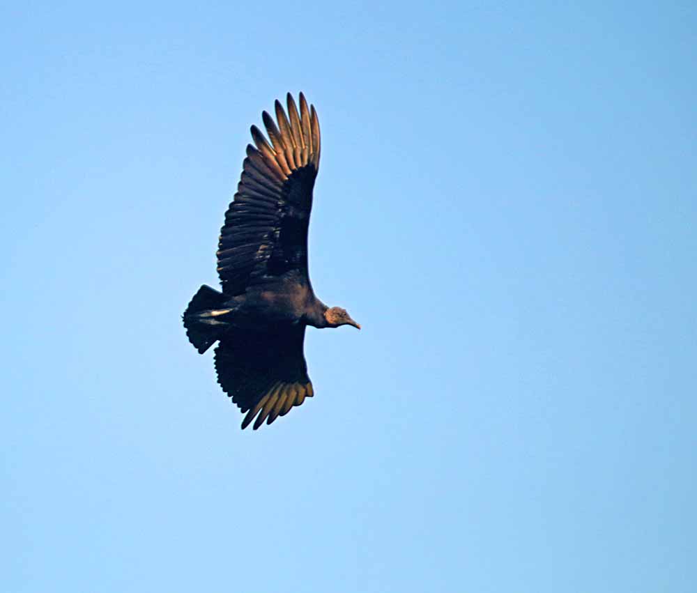 When I look at only the head, I think this is a Black Vulture, but the arrangement of white feathers (in shadows) on the wings show that it is a Turkey Vulture and the lack of a red head, makes it a juvenile. Vultures fly overhead regularly, helping to keep the neighborhood clean. 🙂 And they make flying look so easy and graceful that I can’t stop trying to photograph them, even though seldom a good photo with shadows and movement, but fun anyway! 🙂 And my Turkey Vulture Gallery of course!