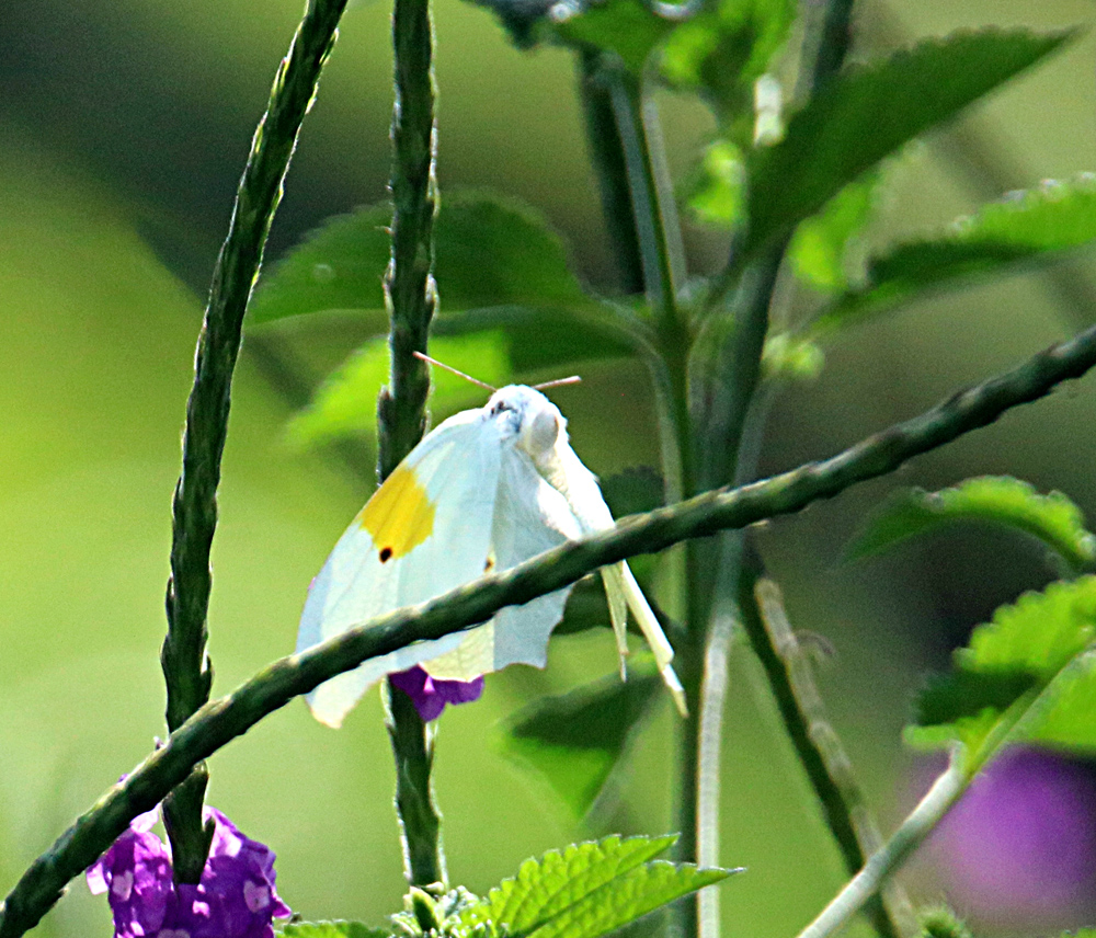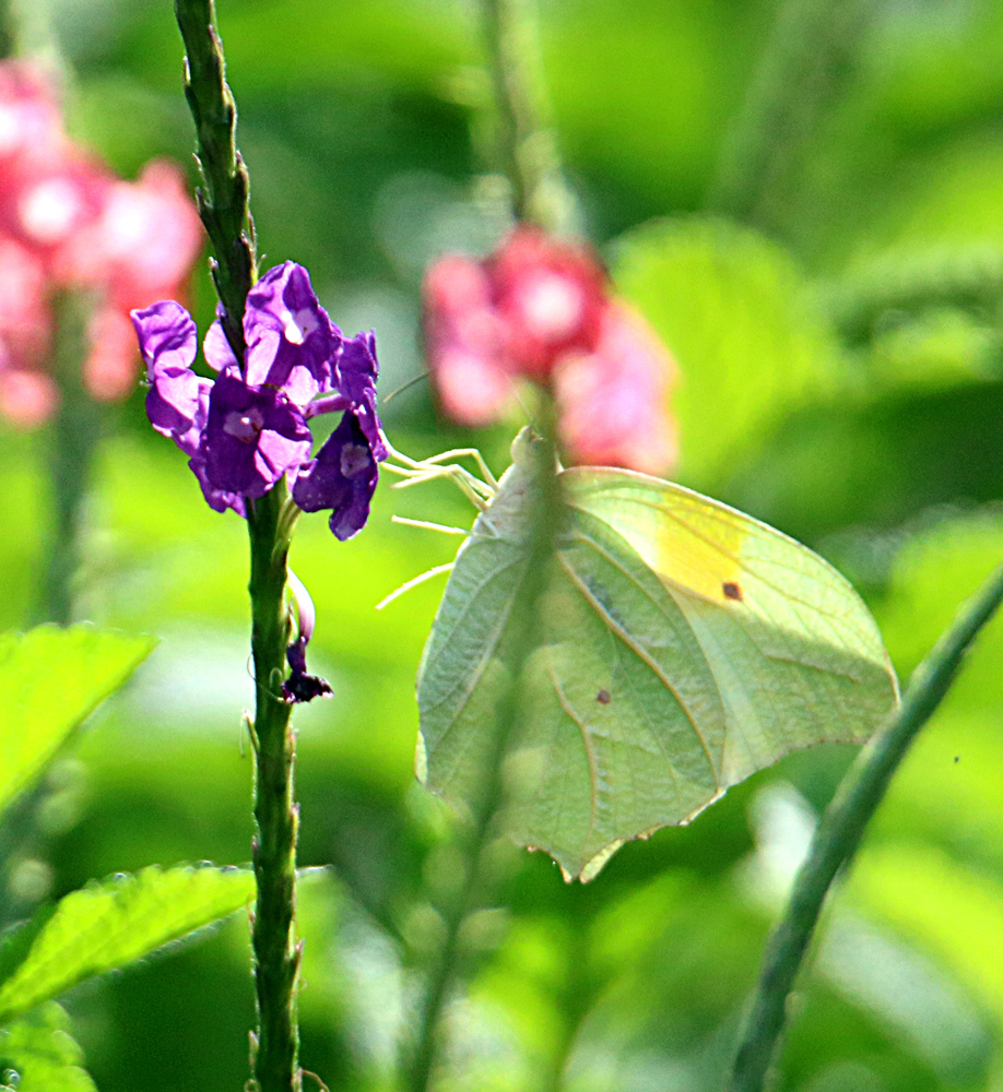 The big yellow patch is what indicates that it is a male, while the female has only the brown spot on each wing. The feature photo is one typical view with a greenish/yellowish hew on the folded wings while the top of wings are usually a bright white like the photo below where the same butterfly is strangely contorted. See more of my photos of this interesting butterfly in my gallery: White Angled-Sulphur, Anteos clorinde. They are found as residents from Argentina to Mexico with migrants going into the Southwestern U.S. and Great Plains.