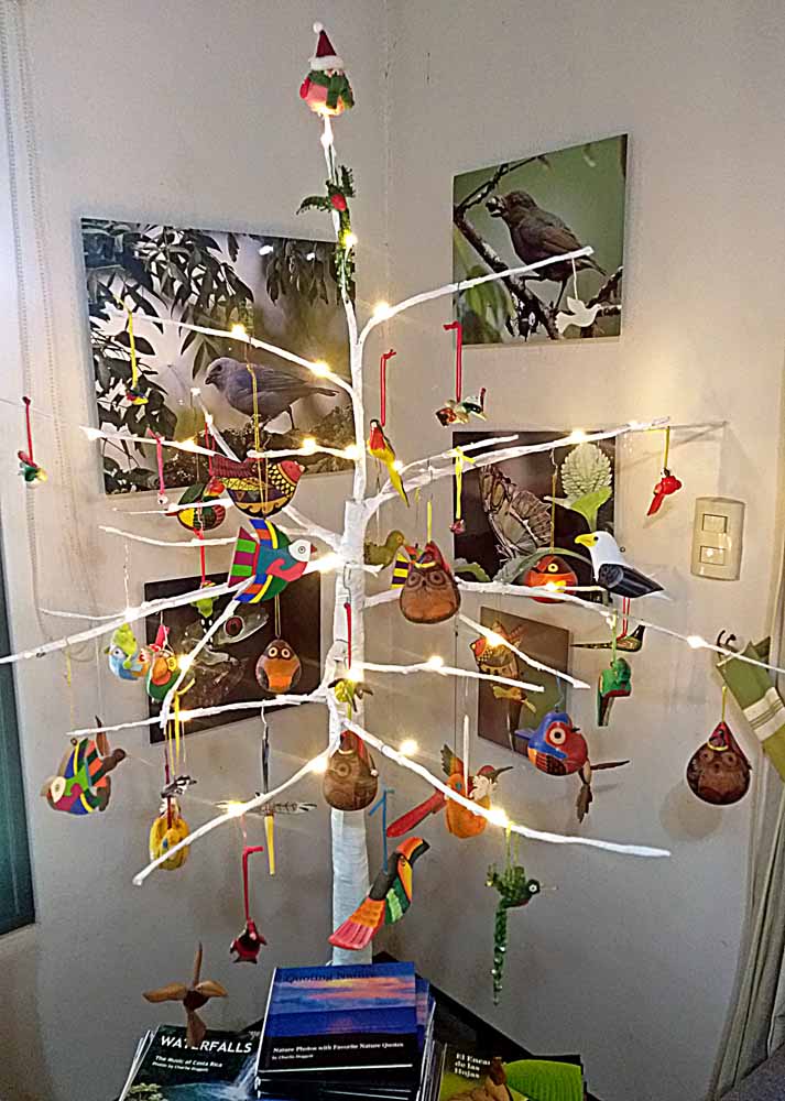 I went to the main hardware store here in Atenas (La Ferretería Vargas & Hijos) and bought some heavier or stiffer wire (12.5 m roll) for a fraction of what the 3 rolls of white electrical tape (cinta blanca) cost and two days later I have totally “rewired” my little Christmas tree with the new heavy wire held to the older thinner wires with lots of white electrical tape wrapped around every centimeter of every limb and the trunk! A LOT OF WORK! But, ta daa! I now have a new tree that is strong enough to hold the artisan birds! 🙂 Here are two pairs of “Before & After” photos to show you what I accomplished . . .