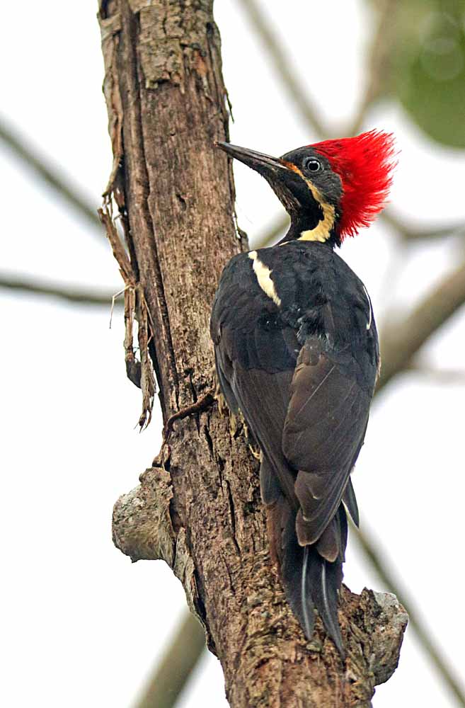 One of our two woodpeckers with the “Woody Woodpecker” hair is the Lineated Woodpecker, Dryocopus lineatus, (my gallery link) “Carpintero Lineado” en español, with the Pale-billed Woodpecker being the other big hairdo woodpecker (his whole head is red!). 🙂 This one sensed that my Cecropia Tree is dying and landed first on the trunk then went straight to a dead limb looking for insects to eat. Because of their “pecking/eating” they tend to stay longer in a tree, making them sometimes easier to photograph than other birds, though the overcast afternoon was poor light that day with a glary white sky. 🙁 Here are two shots from this past Monday. See the gallery for more from all over Costa Rica. He is found only in Central & South America, with North America’s most similar bird being the Pileated Woodpecker (linked to my gallery of one seen on Nashville’s Stones River Greenway).