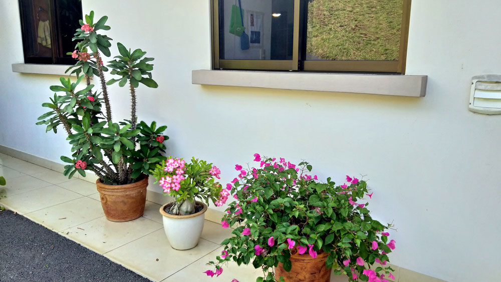 In 2017, in this same month of April, my next-door neighbor and artist friend, Anthony, left to go back to the states, hoping to get an art teaching job (never happened). I bought his small flower pot with a small Desert Rose in it. Unfortunately I made no photos of it until this one in 2020 (3 years later) when it was still small as seen here between the larger Crown of Thorns and Bougainvillea, both of which have since died and the Desert Rose has more than tripled in size! 🙂