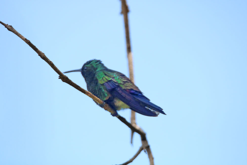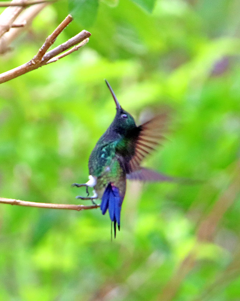 This little guy with the bright blue tail was the first hummingbird I photographed in this house, in a neighbor’s Mimosa Tree, back in 2015! He now hangs out a lot in my Porter Weeds and is similar to the Rufous Tails that are dominant in my garden, but is more colorful. Blue vs Rufous (rusty-brown)! 🙂 See more in my gallery: Blue-vented Hummingbird.