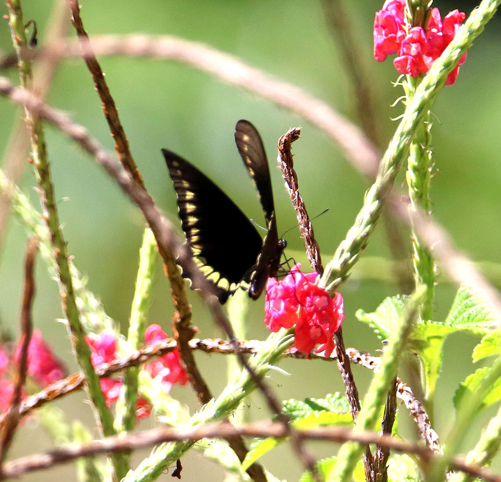 On many days it seemed that these were the only butterflies that could manage in the wind, and many had broken or damaged wings. See more of this most frequent Swallowtail for my garden in the gallery: Polydamas Swallowtail. It now looks like it will be mid to late May before the winds slow down enough to allow for more butterflies.