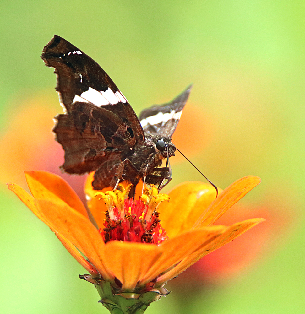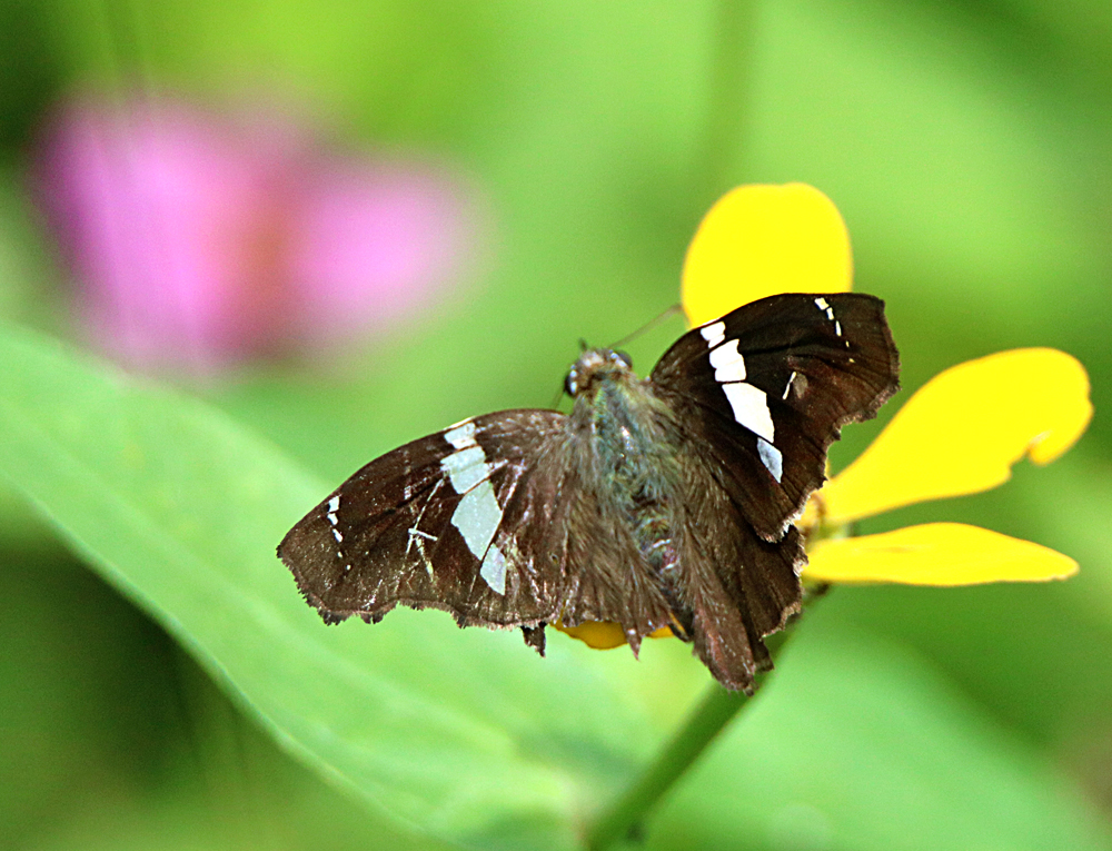 Not gorgeous, but another good pollinator! 🙂 This is my second time to see and photograph the Falcate Skipper, Spathilepia colonius (my gallery link), one of the many Skippers here, found from Argentina to Mexico. Here’s 2 shots, a top view and a side view, which is what I want of all butterflies! (You need both views for easy identification.) 🙂