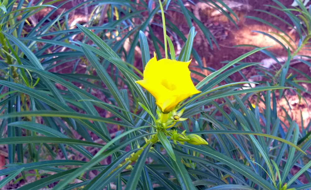On one of my walks to town I used my cell phone to snap a photo of this yellow flower along the side of the road. iNaturalist AI labeled it a Be-still Tree – Cascabela thevetia (linked to iNaturalist). “Be still” was appropriate on that day as the wind was blowing strongly and this flower would not be still for a photo! 🙂 There is another species in this genus known as Yellow Oleander (Cascabela thevetiodes) and thus some people call this one Yellow Oleander too. They are similar.