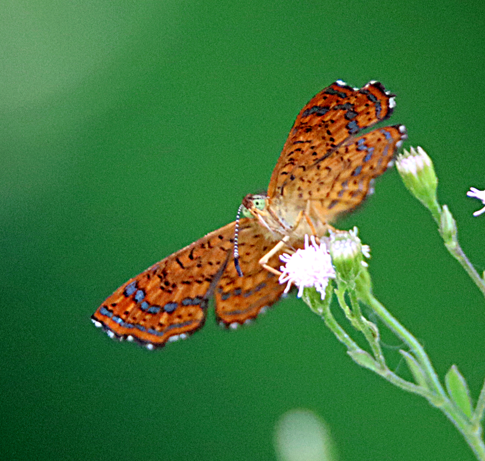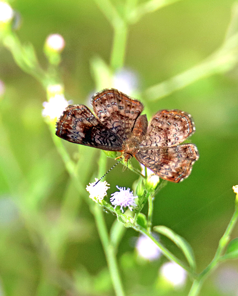 Well, forget that business of the last four days of my “final” butterflies of the season. I keep finding more and even new ones like this beautiful earth toned “Theona Checkerspot” (Chlosyne theona) in my garden. Another tiny one that stays near the ground in our windy weather now.