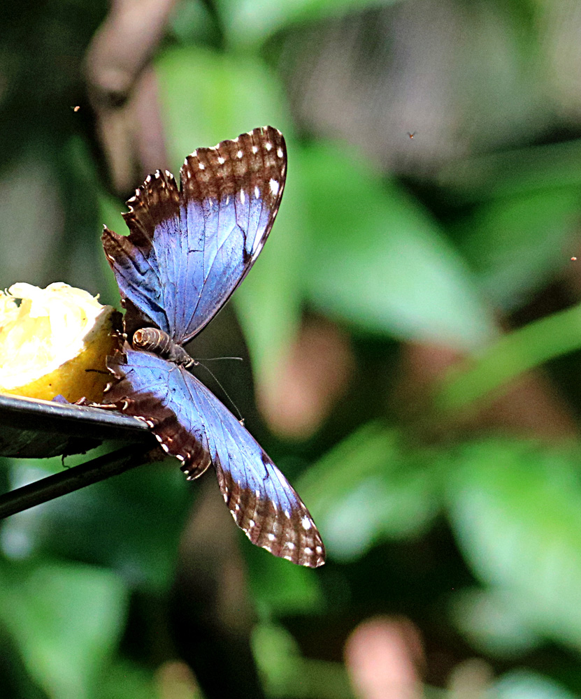 At least that is what everyone calls them in English! 🙂 While the “official” common name in English is “Common Morpho!” And in Spanish everyone is covered with “Mariposa Morfo Azul Común” or “Common Blue Morpho Butterfly!” 🙂 And “Common” is good because there are other species with blue tops! 🙂 See my photos from many different locations of this, the National Butterfly of Costa Rica, Common Morpho, Morpho helenor gallery. Four shots I liked from Punta Leona after this first introductory photo . . .
