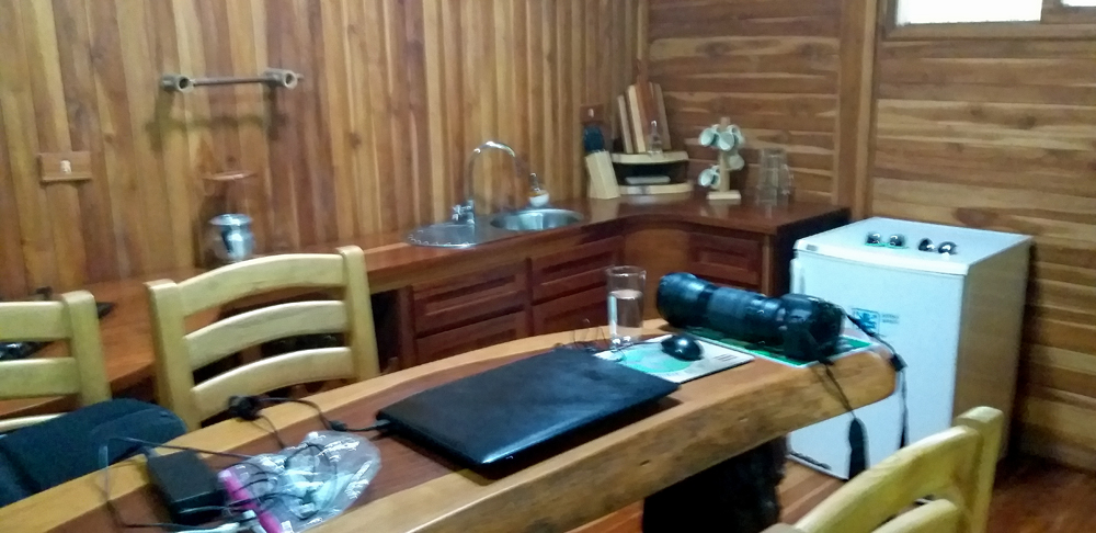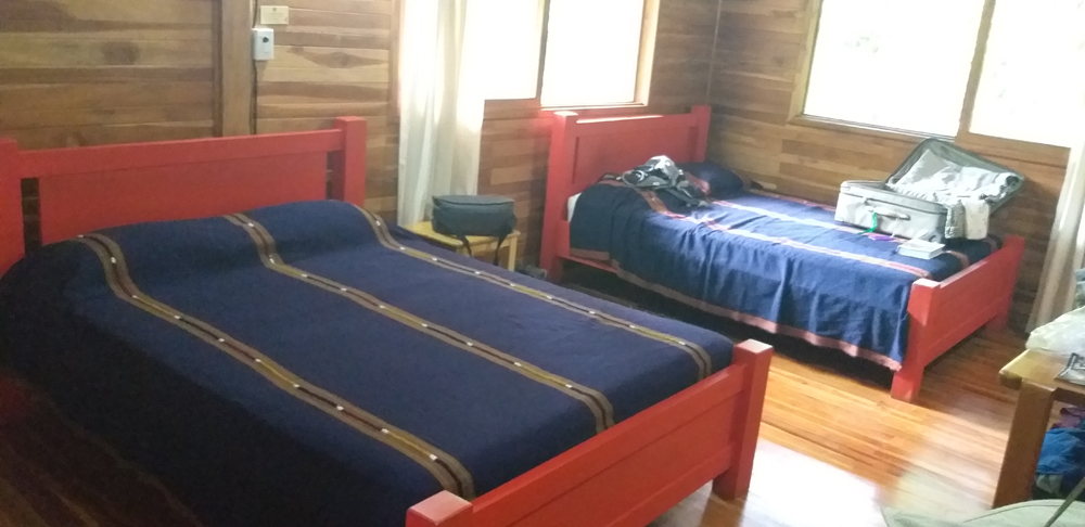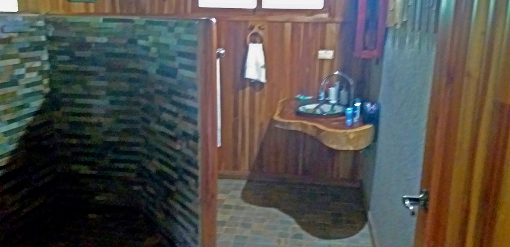 The electricity is from solar-powered batteries (a bunch of batteries!). The “hot” water was a separate device with a long pipe running back and forth on a board out in the sun. Since it is rainy season and limited sun I barely had warmish water after letting it run for three minutes. Showering first thing in the morning means a cold shower. Ahhh nature! 🙂