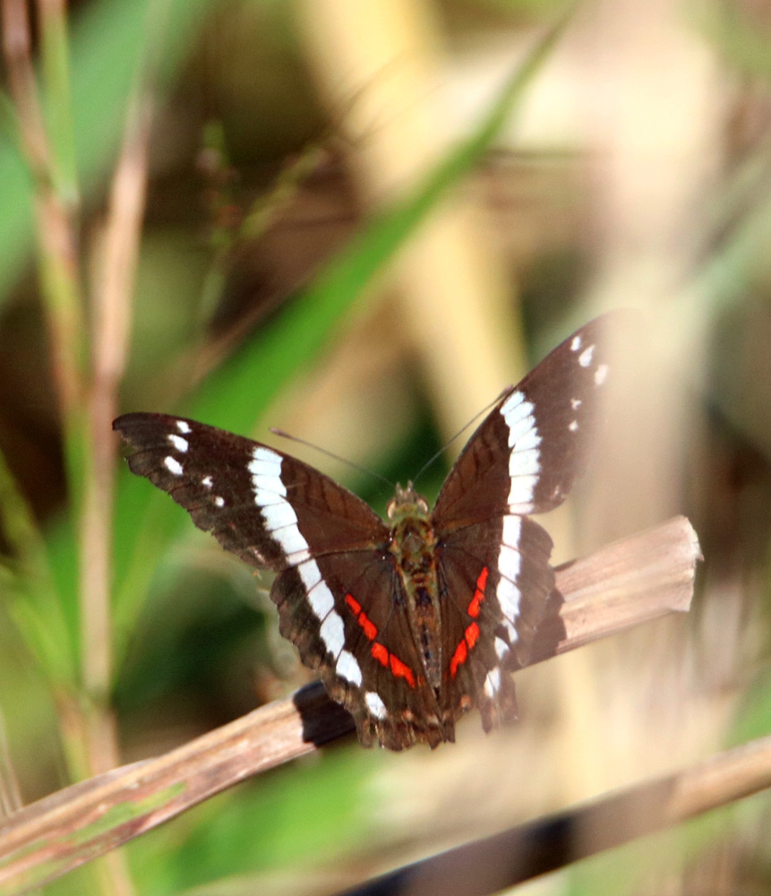 It is not all little dull brown butterflies in the cow pasture, but some colorful ones too! 🙂 It was also interesting to note that most of them stayed close to the ground or down low in the tall grasses, only occasionally flying or landing up higher to, I guess, absorb the sun or eat from a flower. This one may be my most seen butterfly all over Costa Rica, as you can see in my gallery: Banded Peacock, Anartia fatima.